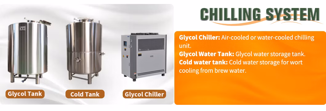 Система также должна быть оснащена системой автоматического или ручного управления, системой фрезерования солода, системой CIP, системой охлаждения, системой парового нагрева, пневматическая система и т.д.