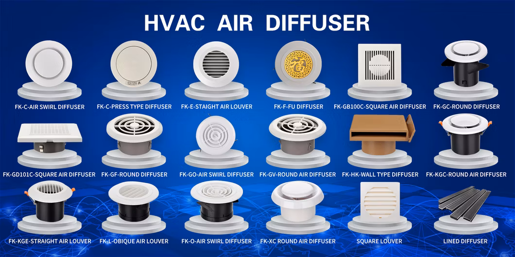 Пластиковый Круглый потолочный воздушного диффузора - регулируемый Круглый потолочный Диффузор предназначен как для обогрева и охлаждения. Все размеры имеют четыре внутренние кольца подшипников, единообразие внешнего вида где различные форматы используются в том же районе. Он обеспечивает единый 360° выполнять план выставки и отличную производительность в переменной объем воздуха.
