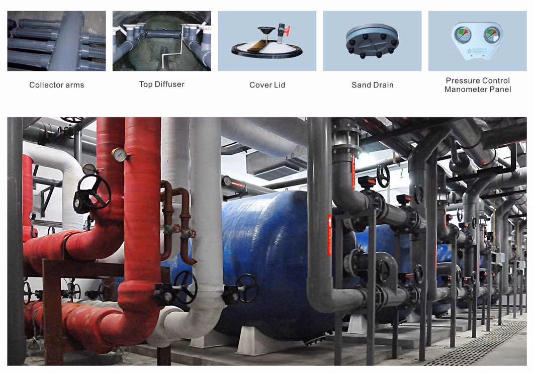 Горизонтальные песочные фильтры изготовлены из полиэстера, усиленного стекловолокном; они устойчивы к коррозии и обладают высокой механической, химической и тепловой устойчивостью, а также обеспечивают высокое качество воды благодаря большей фильтрующей способности. Показатели мутности и загрязнения фильтрованной воды снижаются благодаря увеличенной емкости хранения, а время между промывкой обратно увеличивается пропорционально высоте фильтрующей ложи, что означает меньшее количество прерываний фильтрации, а также снижение расхода воды, поскольку количество необходимых обратных промывок уменьшается, а фильтрующие материалы меньше размывания.
