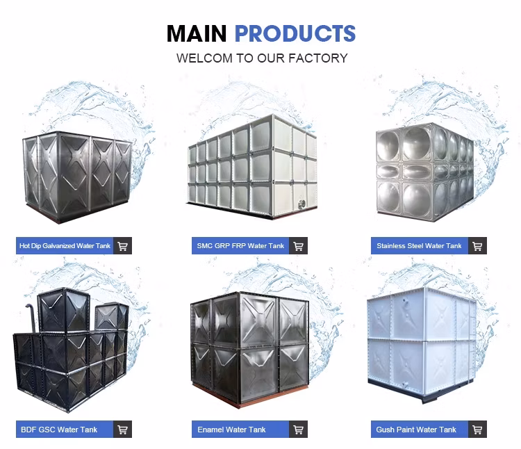 Или  РЕЗЕРВУАР ДЛЯ ХРАНЕНИЯ ВОДЫ, мы можем поддерживать вас 3 типами резервуаров, которые принимают различные материалы: Резервуар для воды SMC(FRP,GRP), резервуар для воды с горячим оцинкованным оцинкованным покрытием и резервуар для воды из нержавеющей стали. Если какой-либо предмет вас приветствует, Добро пожаловать здесь! Теперь ниже приведен обзор резервуара для воды SMC(FRP,GRP)!
